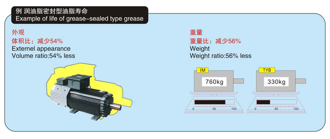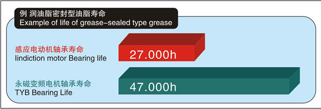 因?yàn)檗D(zhuǎn)子幾乎不發(fā)生損失,所以軸承溫度較低,密封油脂壽命大約延長(zhǎng)至本公司YVF2系列變頻器專用IM的1.5-2倍(約32,000-47,000 Hr),可減輕維護(hù)工作。