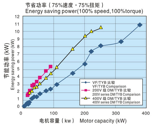 下圖是通過(TYB電機(jī)++INV)組合下的綜合效率與(感應(yīng)電機(jī)(IM)+INV)、(直流電機(jī)(DM)+直流驅(qū)動(dòng)裝置)的綜合效率之差來表示節(jié)省功率的。